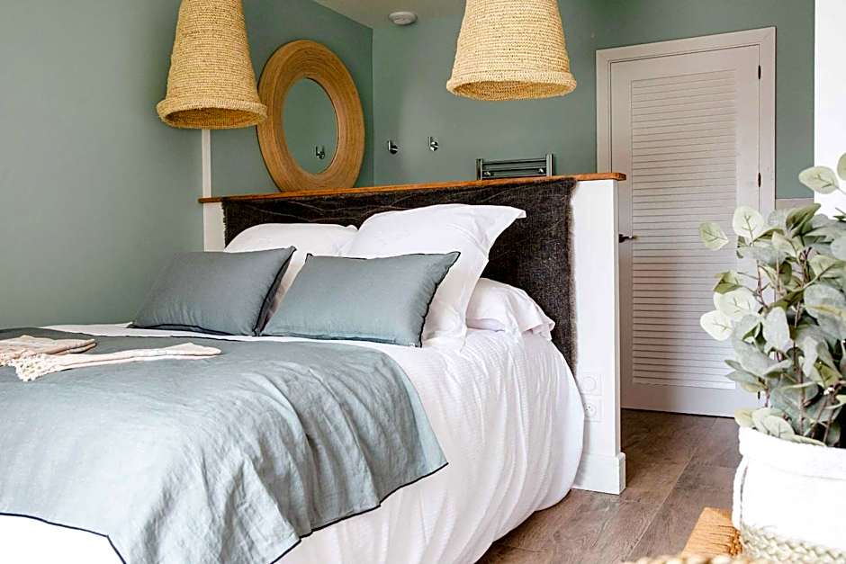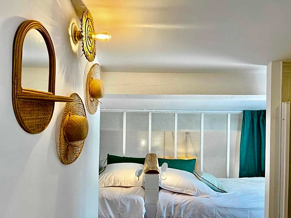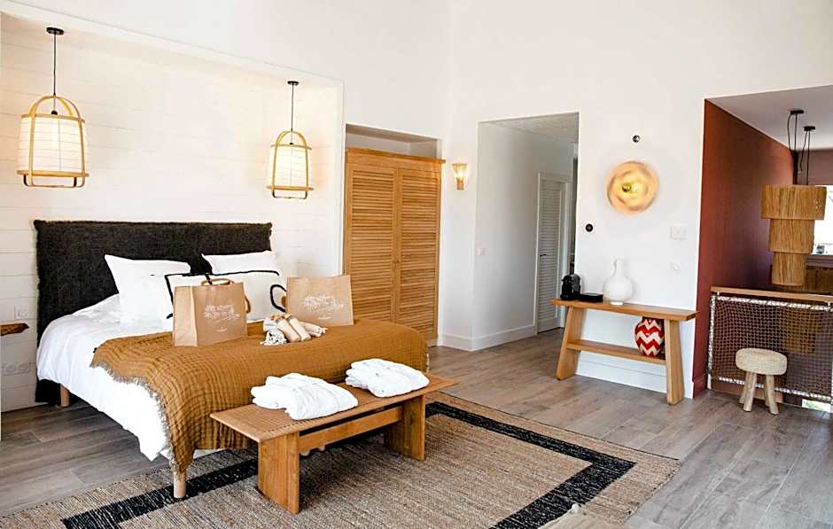 This Suite of 207 ft² is located on the ground floor of our villas on the peninsula adjoining the large house on the Ile de la Lagune, a few steps from the small wooden pontoon. It features a double bedroom and a twin bedroom, 2 shower rooms and 2 WCs, hair dryer, hair straightener as well as a private garden with a terrace equipped with a private Jacuzzi.
